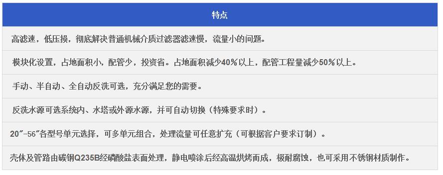 深層介質(zhì)過濾器當(dāng)系統(tǒng)處于過濾狀態(tài)時(shí),加壓水從濾罐進(jìn)口流入布水系統(tǒng),均勻的到達(dá)濾料層。當(dāng)水流過濾料層時(shí),懸浮物被濾料截留。過濾器底部有帶縫隙的集水器,過濾后的干凈水被均勻收集,并流出過濾器。