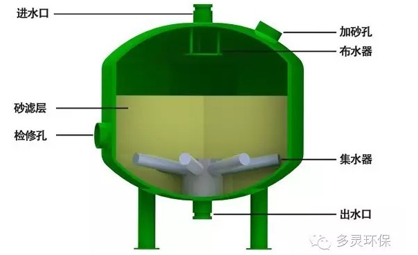 當(dāng)系統(tǒng)過濾狀態(tài)時(shí),加壓水從濾罐進(jìn)口流入布水系統(tǒng),均勻的到達(dá)濾料層。當(dāng)水流過濾料層時(shí),懸浮物被濾料截留。過濾器底部有帶縫隙的集水器,過濾后的干凈水被均勻收集,并流出過濾器。